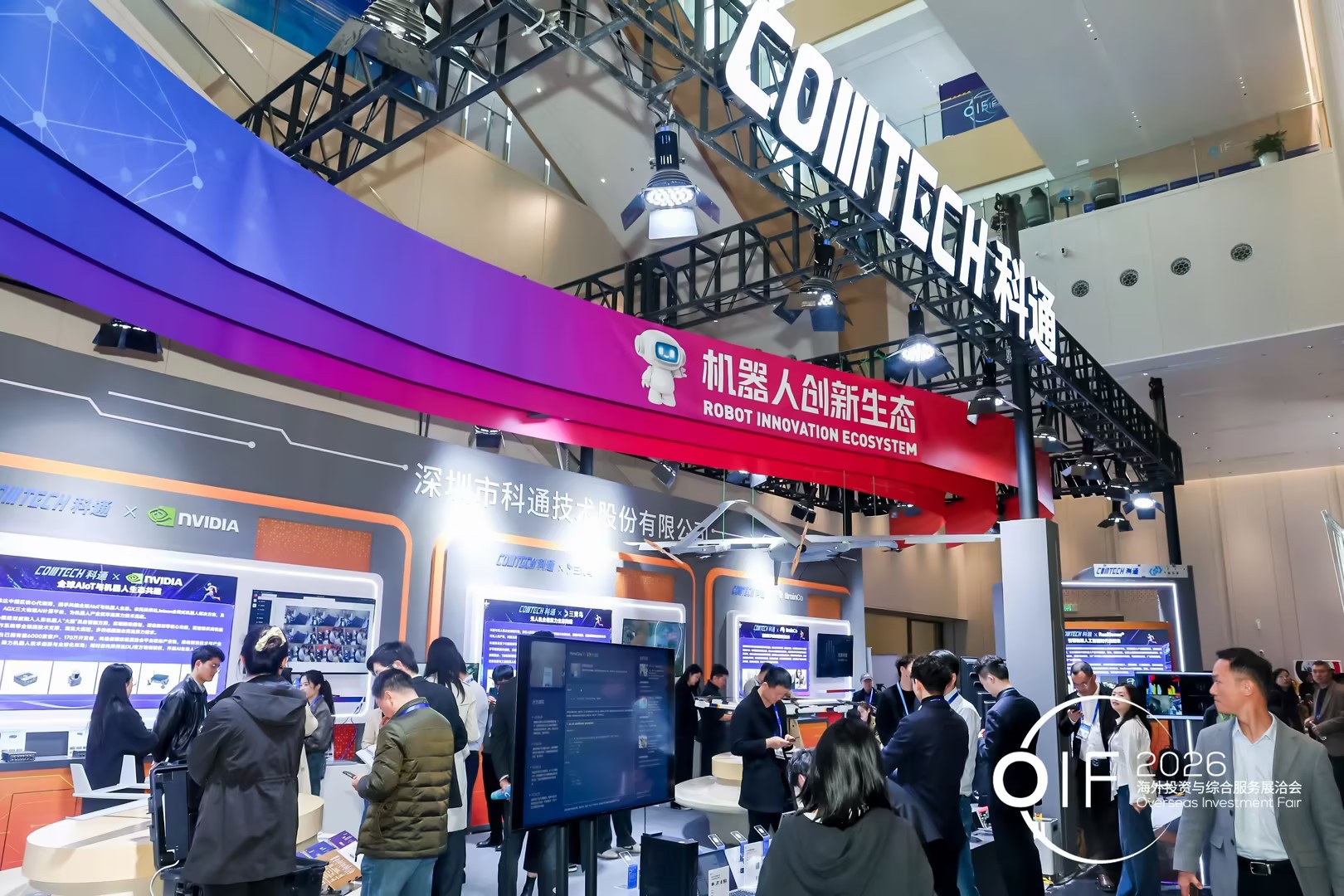 3月26日,首届海外投资与综合服务展洽会在上海盛大开幕,深圳科通技术股份有限公司(以下简称“科通”)与芯擎科技共同亮相此次盛会。在“科通机器人生态”体验区,双方联合展示了在工业机器人领域的最新成果,携手探索从核心芯片到系统生态的“抱团出海”新模式。该区域还聚集了十多家智能硬件企业,展示了包括无人机、无人车到教育机器人等众多成功案例。